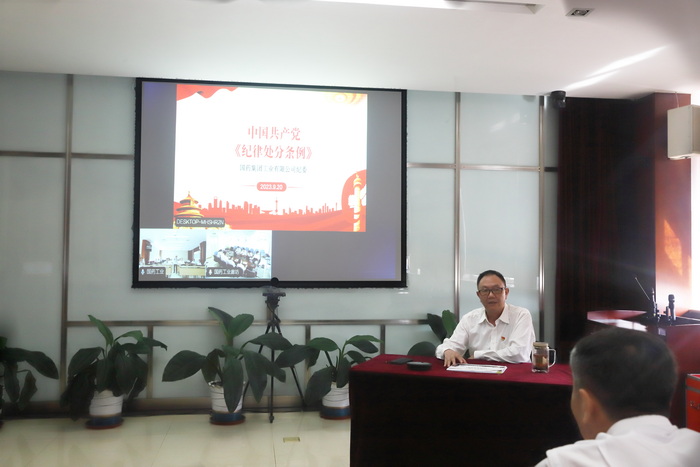 國藥工業黨委副書記、紀委書記、副總經理趙松福以《學習貫徹中國共產黨紀律處分條例,做合格共產黨員》為題講授了專題黨課。趙松福對《中國共產黨紀律處分條例》的歷次修訂情況和最新修訂的主要內容進行了詳細講解,并要求全體黨員干部帶頭嚴格遵守和堅決維護紀律,明底線、知敬畏,做到自重、自省、自警、自勵。
